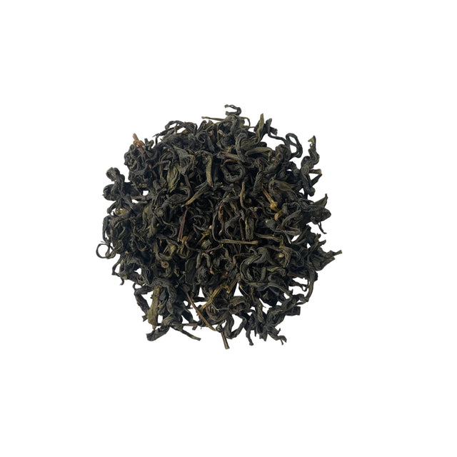 Kamairicha is a centuries-old traditional Japanese green tea which is made by heating the leaves in a pan instead of the typical steaming process that senchas go through. It is the common method of producing Chinese green tea, but is quite rare today in Japan. Rather than producing the typical round pellet shape associated with gunpowder tea, the Japanese method gives the shape of a comma (i.e., the punctuation mark).