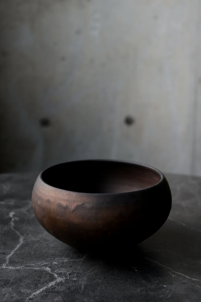 Midnight ash matcha bowl was created using a bronze glaze fired in a way that leaves it charred black with hints of bronze finish.