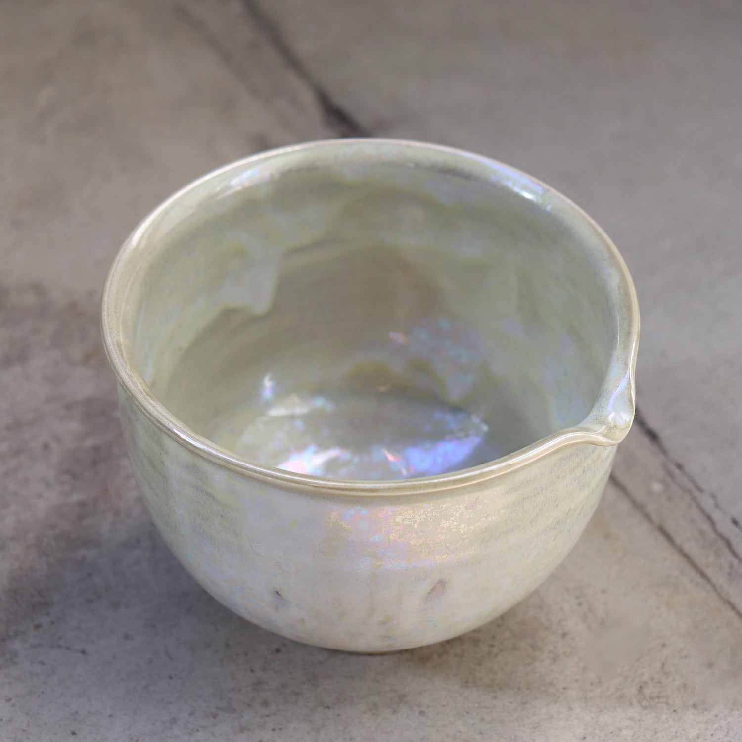 This katakuchi-style matcha bowl is finished in a delicate pearl glaze that reflects light softly rather than brightly. The surface holds a calm, refined presence—clean, balanced, and understated—allowing the focus to remain on the ritual itself.