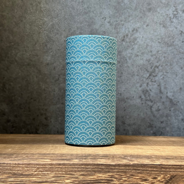 限定版の布製茶筒。ゴム製の内蓋で密閉性を高めています。青い背景には、日本の伝統的な波模様が描かれています。