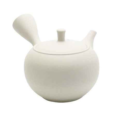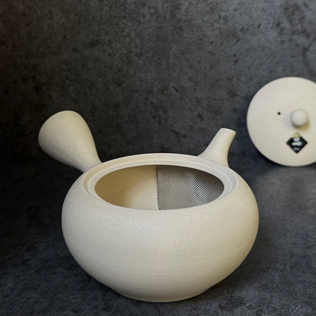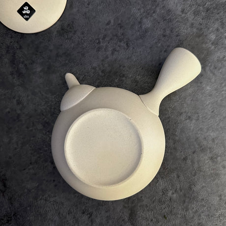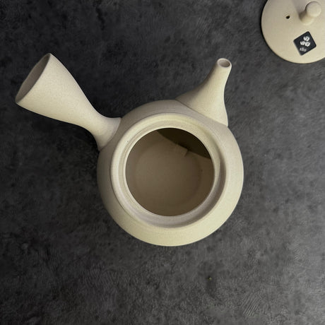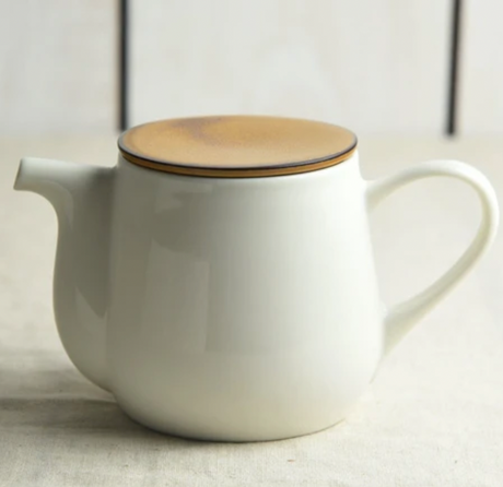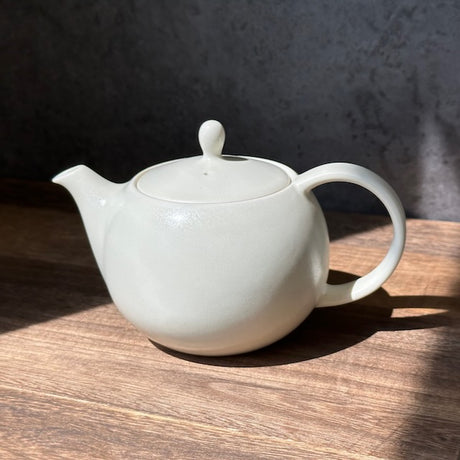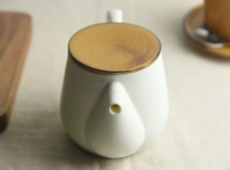 山津窯 (美濃焼、岐阜): ミニマリスト フラスタム急須 真鍮ハンドル付き急須 (燕三条)、白晋山窯ヤマツ 土瓶白釉 (真鍮ツル)