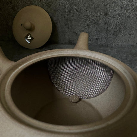 山津窯 (美濃焼、岐阜): ミニマリスト フラスタム急須 真鍮ハンドル付き急須 (燕三条)、淡いブルー 晋山窯ヤマツ 土瓶 白藍釉 (真鍮ツル)